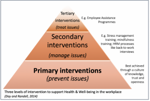 There are three levels of intervention where organisations could support the health and well-being of their employees (illustrated on this diagram)- by preventing, managing and treating issues.