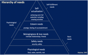 Looking at Maslow’s hierarchy of human needs (illustrated on the diagram on the right), we are reminded how important our psychological needs are in addition to our basic human needs.